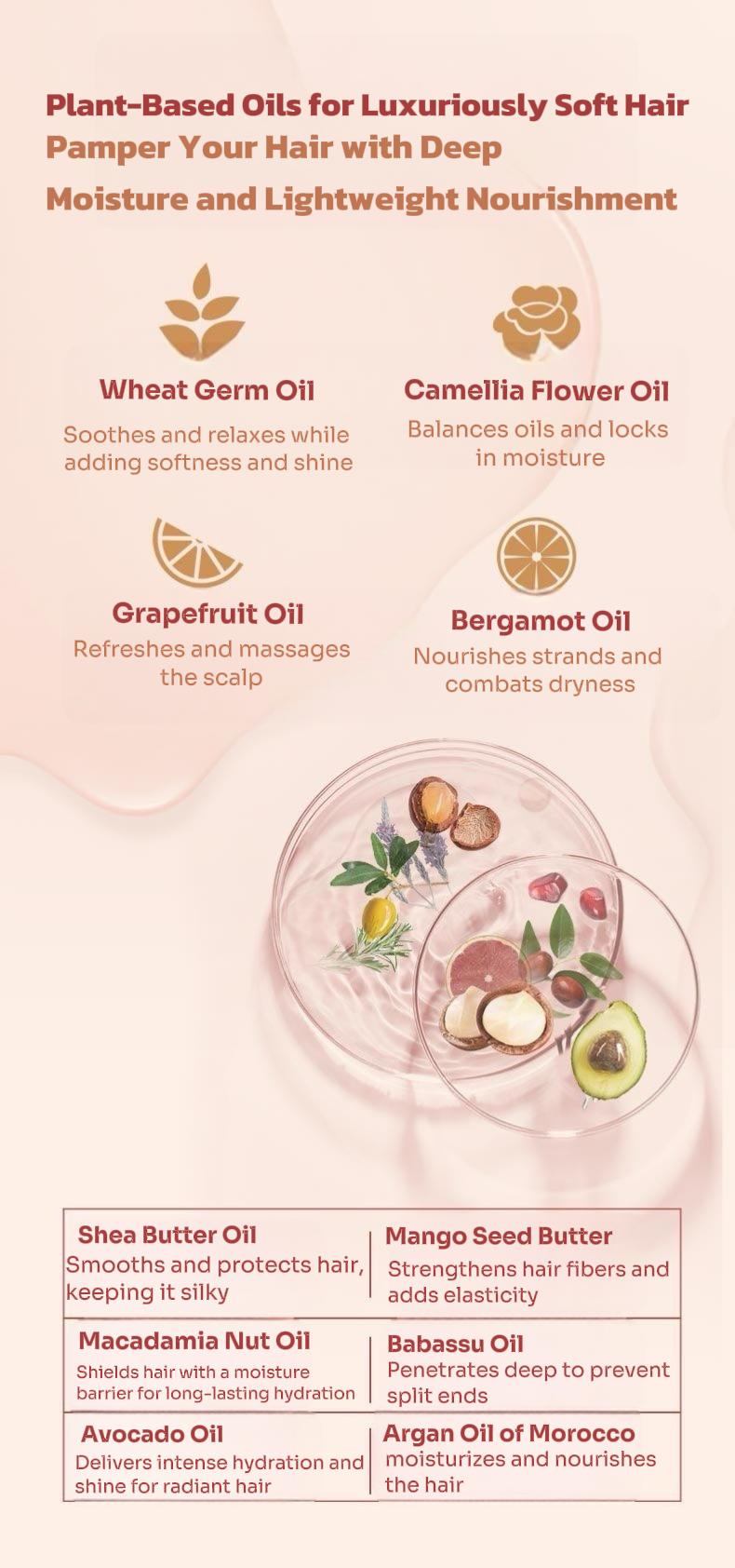 Key information: Infused with a blend of nourishing ingredients: Avocado oil, Jojoba seed oil, and Squalane to deeply moisturize and soften your hair.
